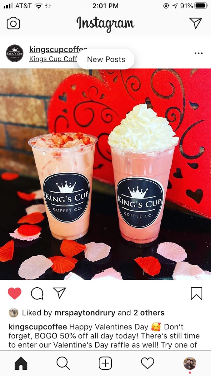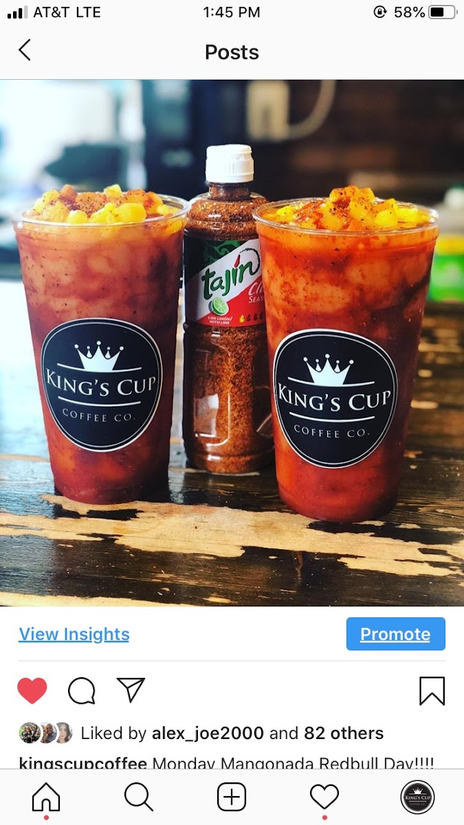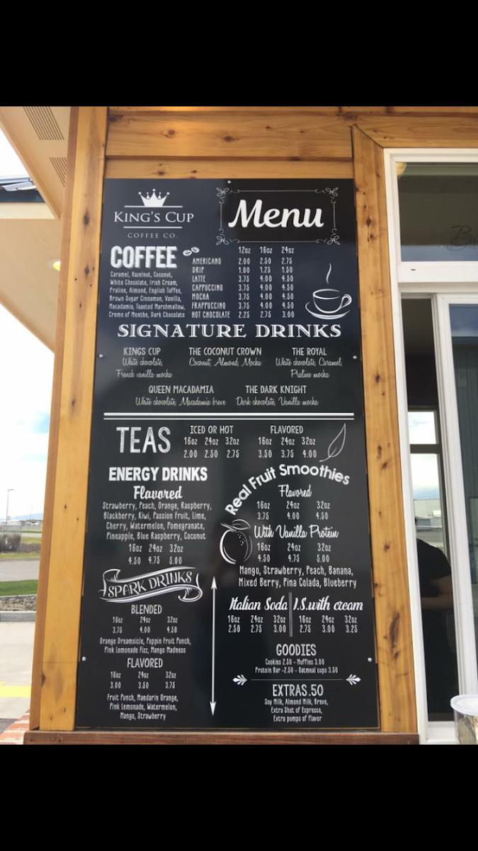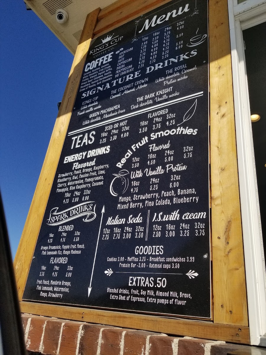 Signature Drinks showcase specialty coffee creations with unique names like Kings Cup, The Coconut Crown, Queen Macadamia, and The Dark Knight, providing a diverse range of flavored coffee beverages.